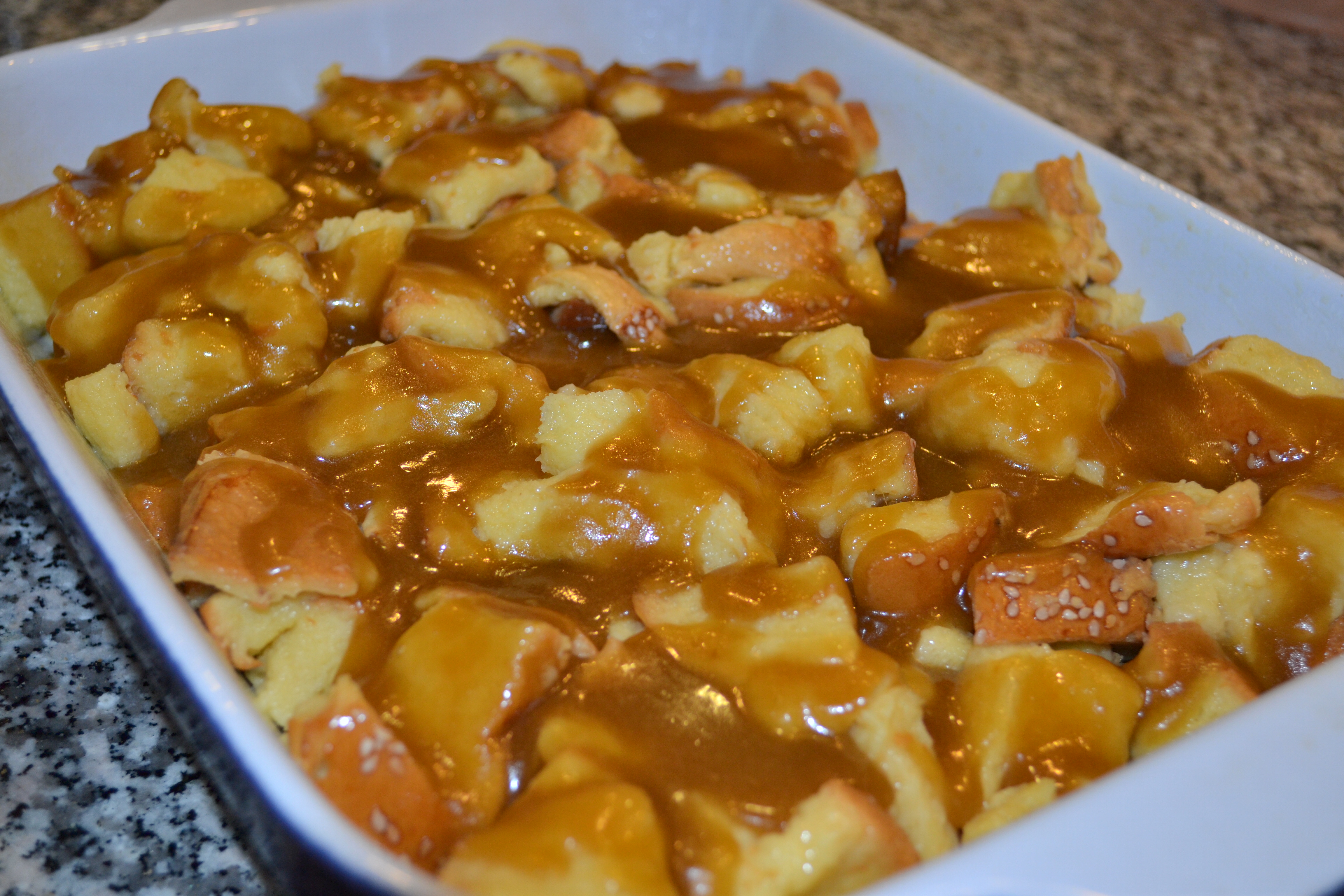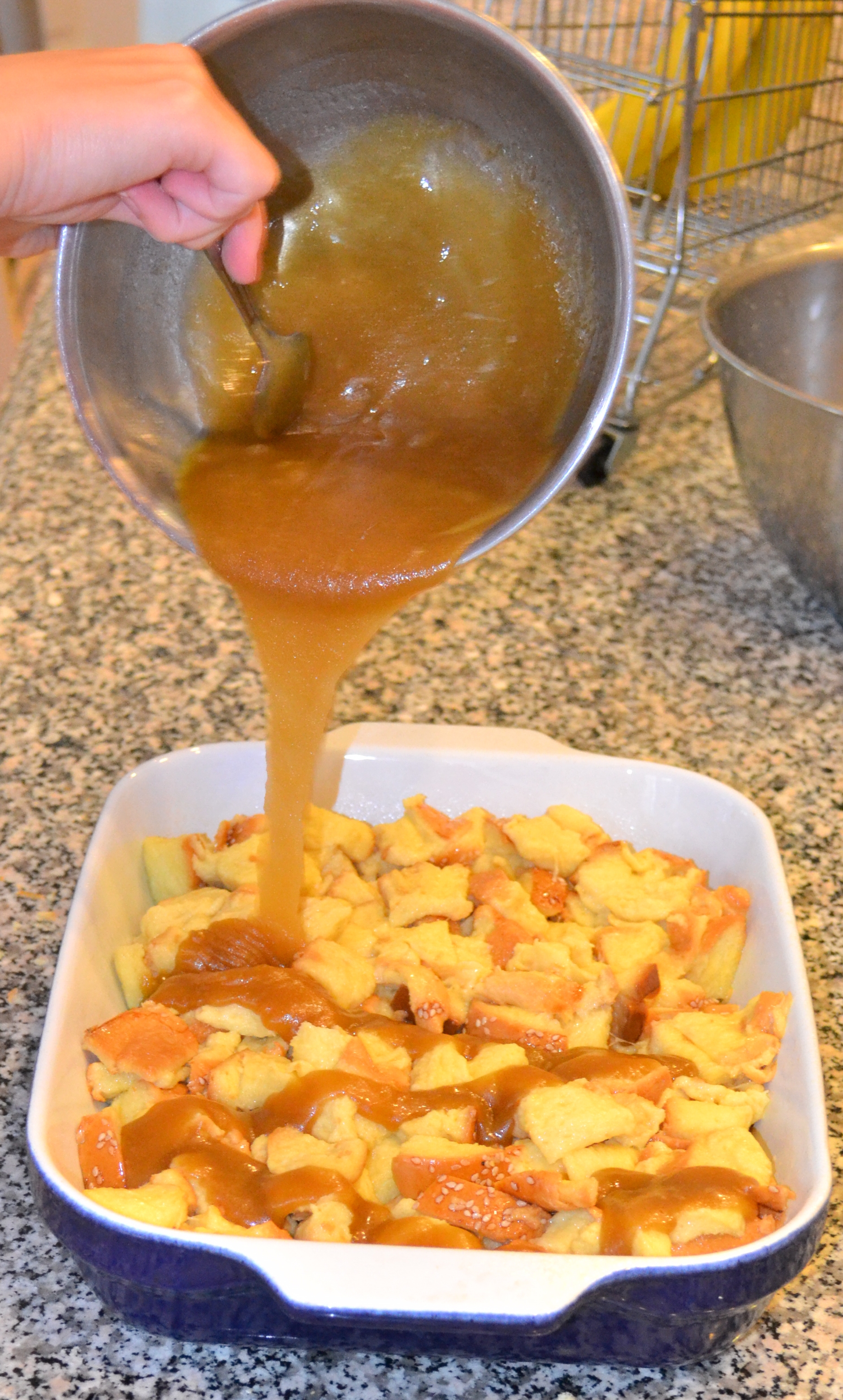 Next step: I mixed together brown sugar, maple syrup, and melted butter and drizzled it over the bread mixture.