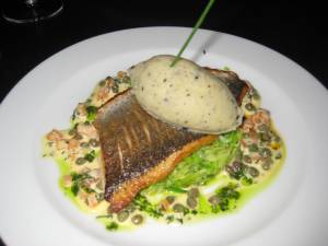 This is the grilled sea bream, with saute leeks, tapenade mash, tomatoes, capers, and dill beurre blanc.