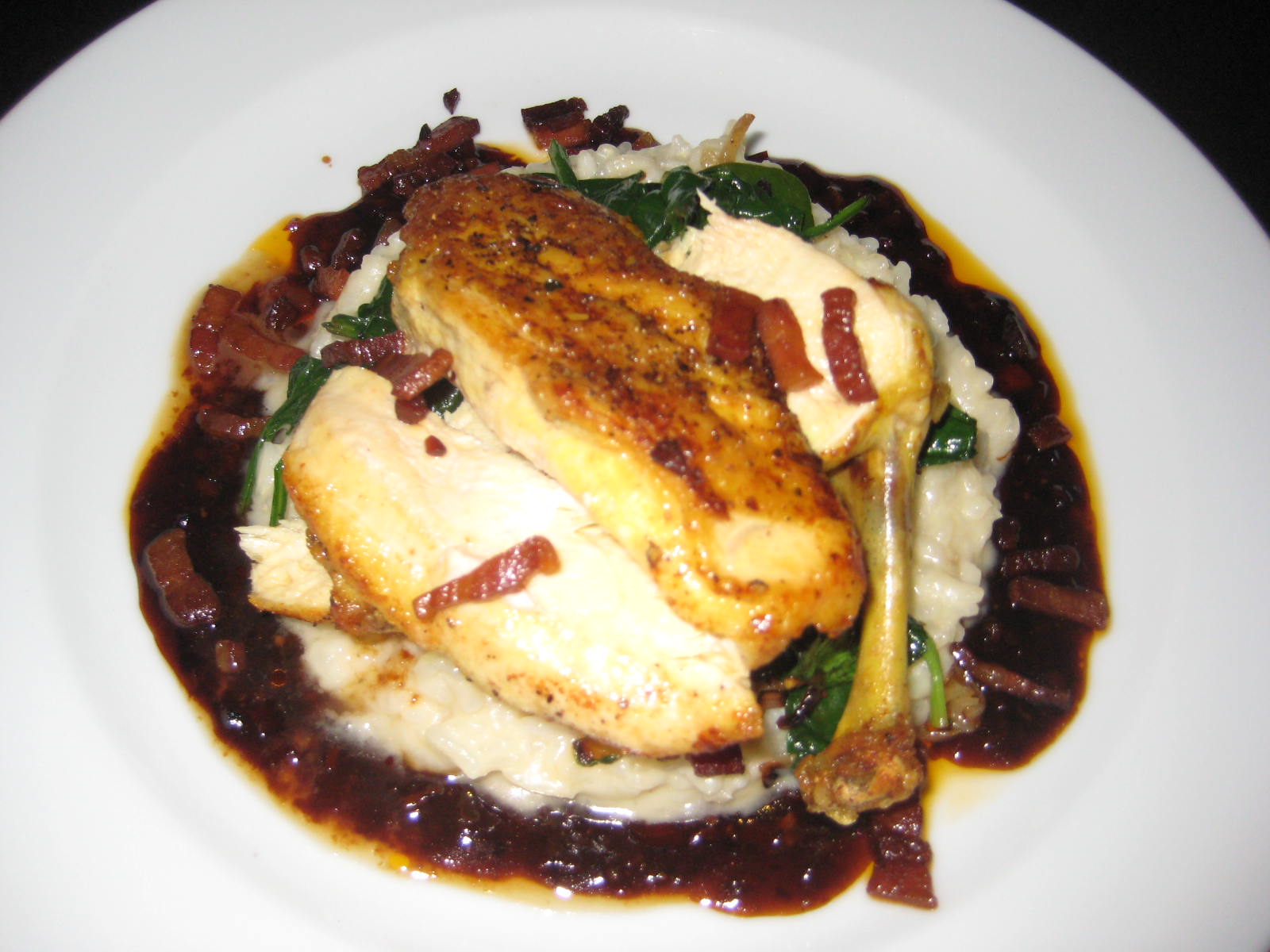 Corn-fed chicken, smoked bacon and lemon thyme risotto, buttered spinach, chili, coriander, and ginger jus.