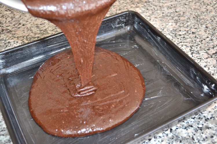 Pour into prepared pan and bake for about 20 minutes, or until a toothpick inserted in the center comes out with a little batter and a few moist clumps clinging to it. Do not over bake. Remove from oven and let cool on a wire rack.