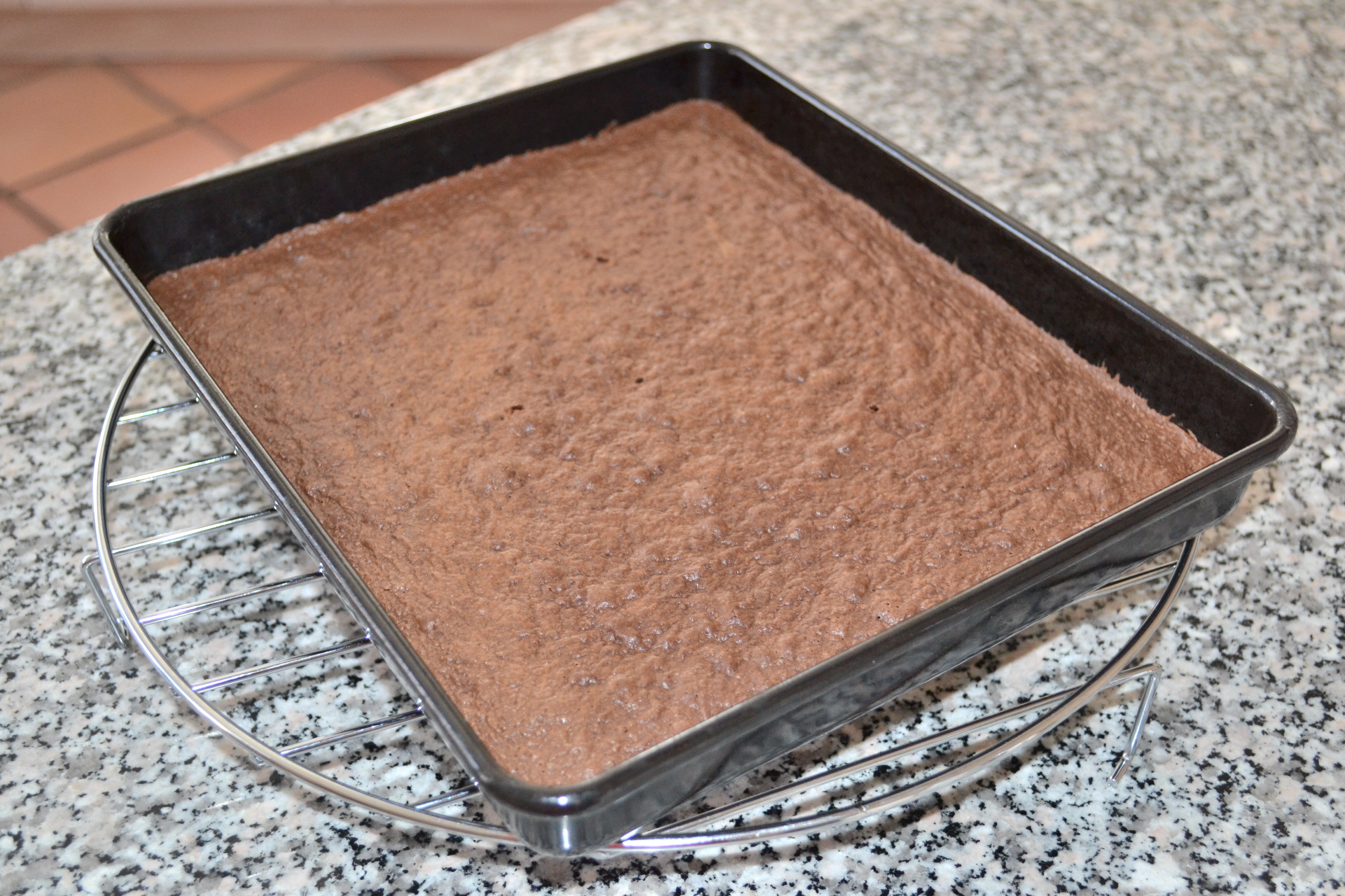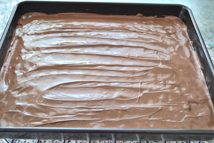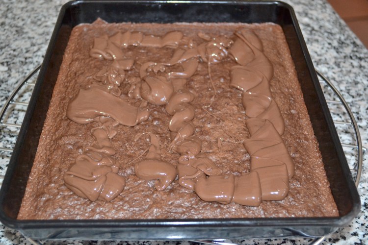 Then, while the brownies were still warm. I heated up about a cup of Nutella in the microwave for 20 seconds and poured it over the brownies 🙂