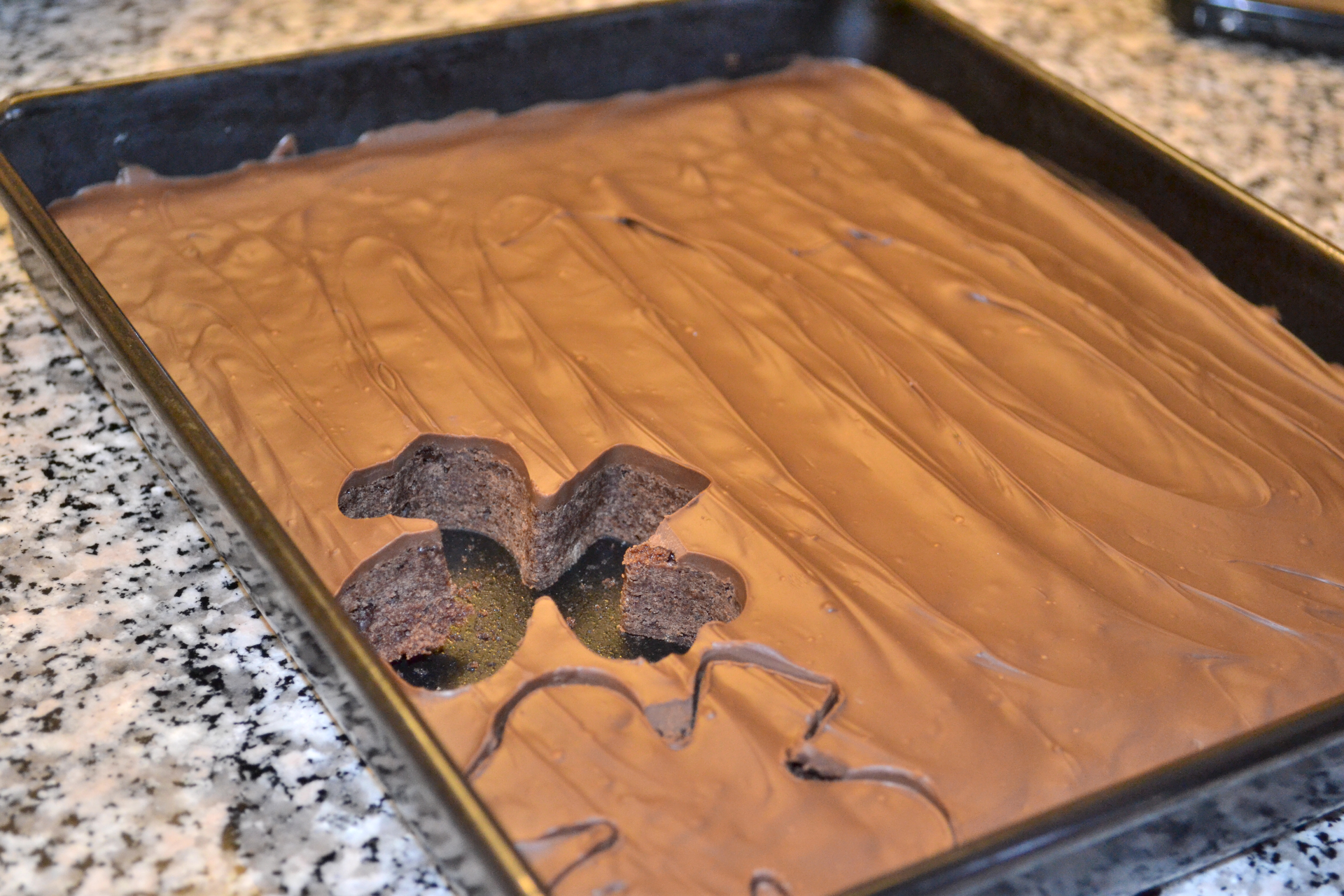 Finally, I folded in flour and salt and poured the batter into a pan greased with lots of butter. I used a larger pan so I would have more surface area for the cookie cutter. I baked the brownies for about 20 minutes.