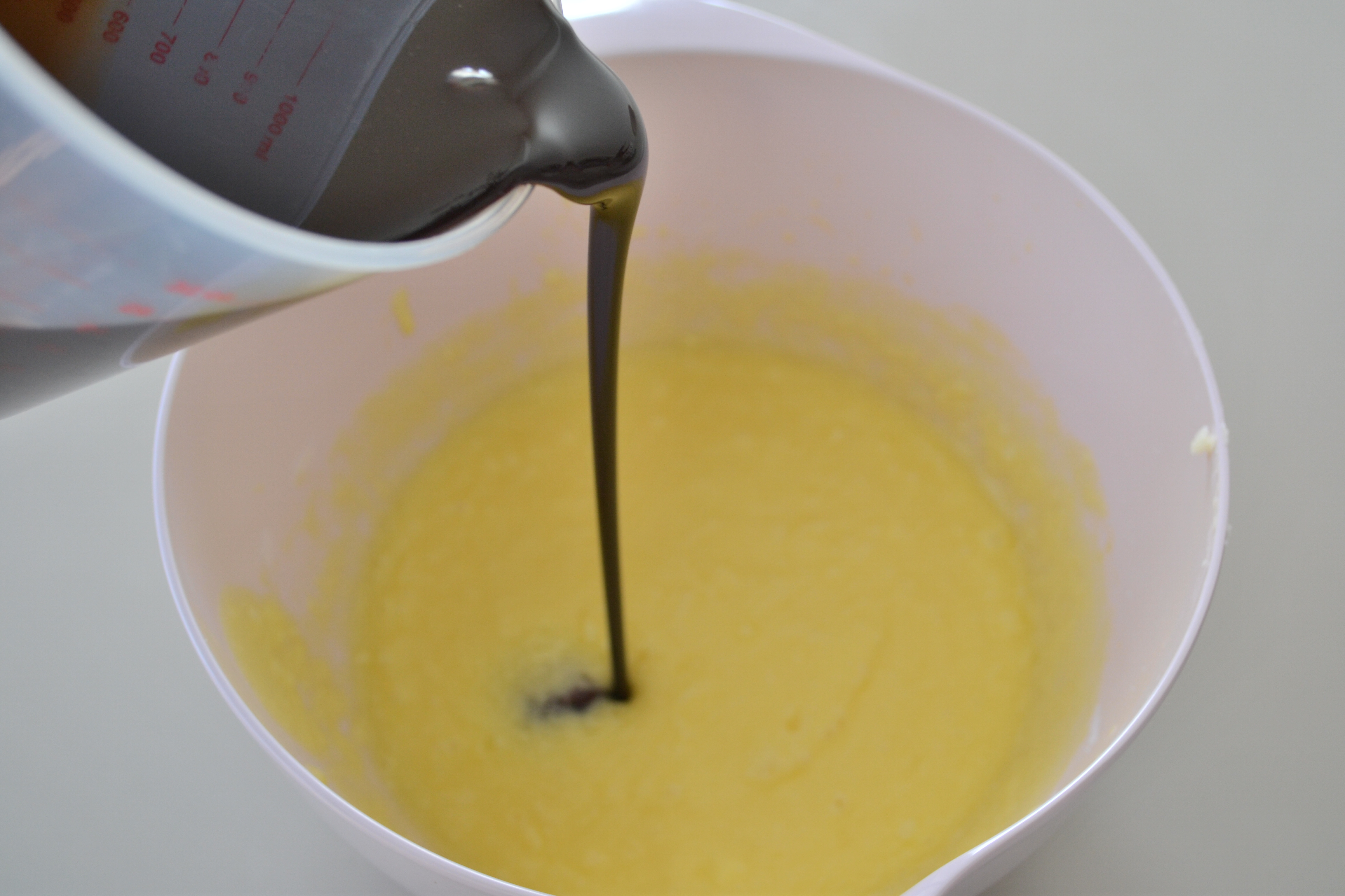First, fluff the butter and sugar together – then beat in the eggs, one at a time.