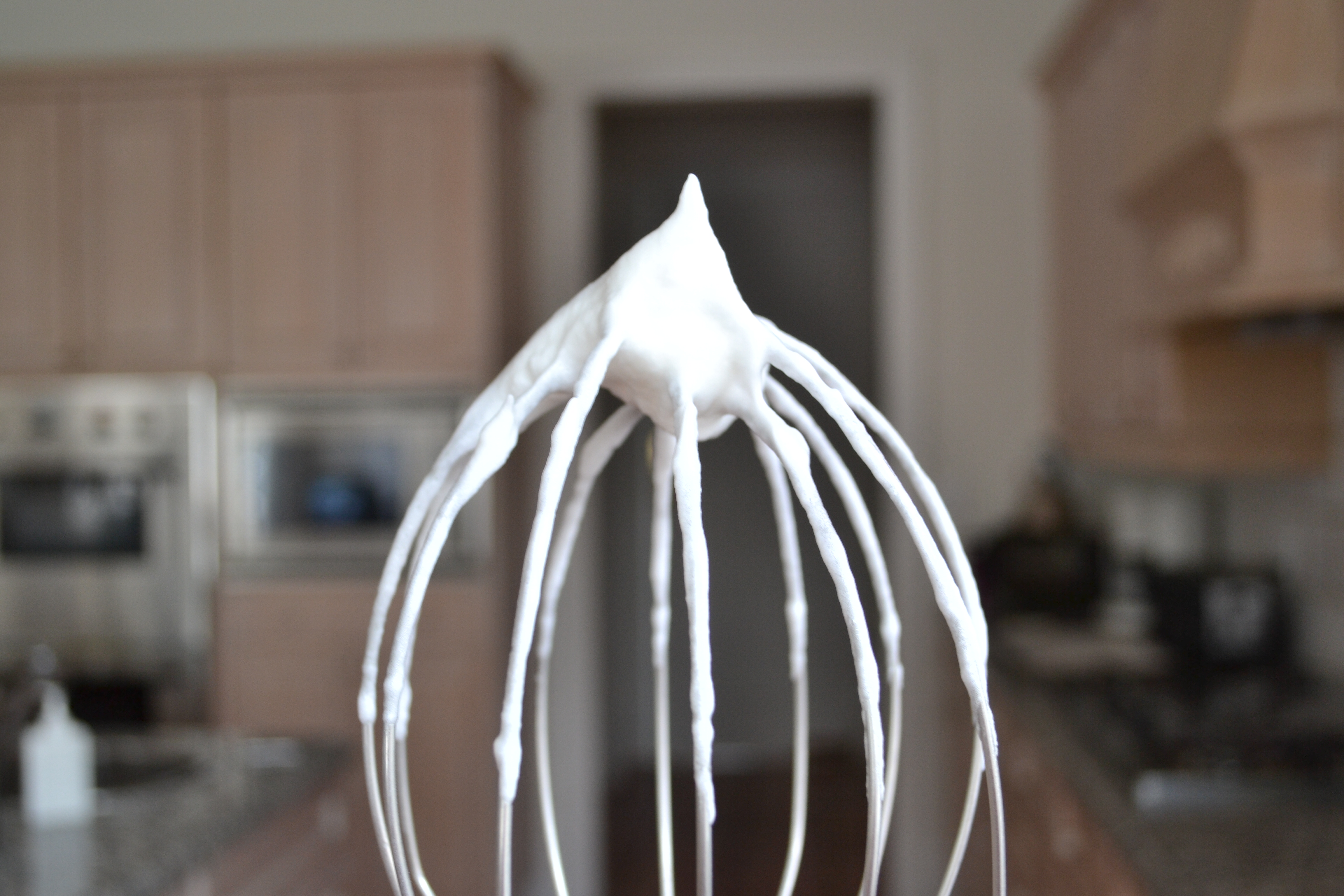 I started off these macarons by whisking egg whites with granulated sugar until the mixture formed stiff peaks.
