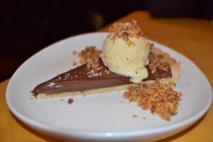 We asked our server which should we try next, the cauliflower and truffle crostini or the dessert. Once she told us what the dessert was – a dark chocolate torte, served with hazelnut and bacon bits, and smoked ice cream – Ellie shrieked.