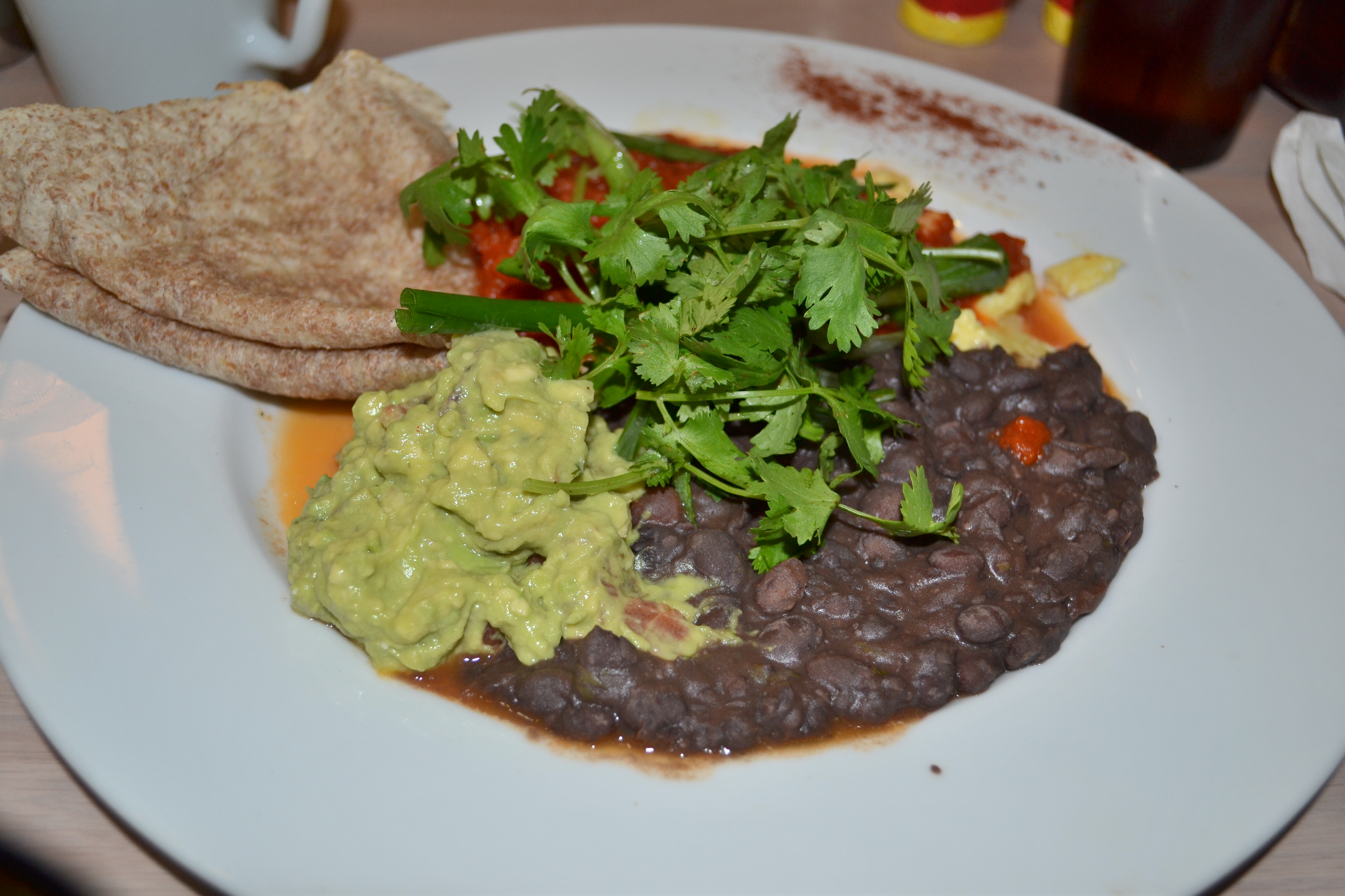This traditional Mexican breakfast comes with cheesy scrambled eggs topped with chipotle salsa, a large side of guacomole, smashed beans, and a warm wholewheat tortilla.